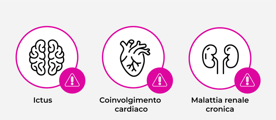 Può inoltre svilupparsi danno d’organo, come ictus, malattia renale cronica o coinvolgimento cardiaco, conseguente a episodi ricorrenti di TTP sia conclamati sia subclinici.1